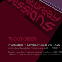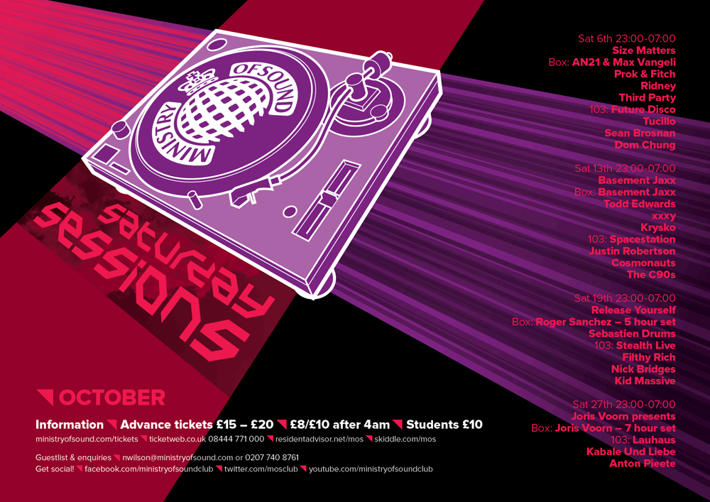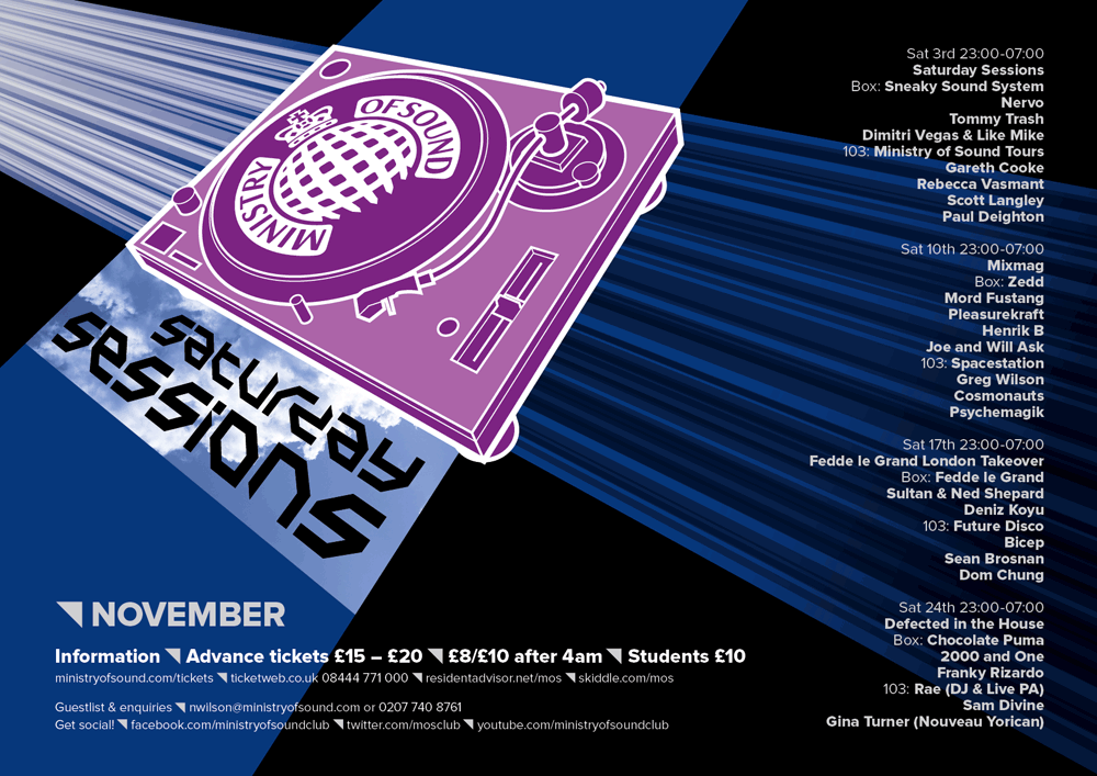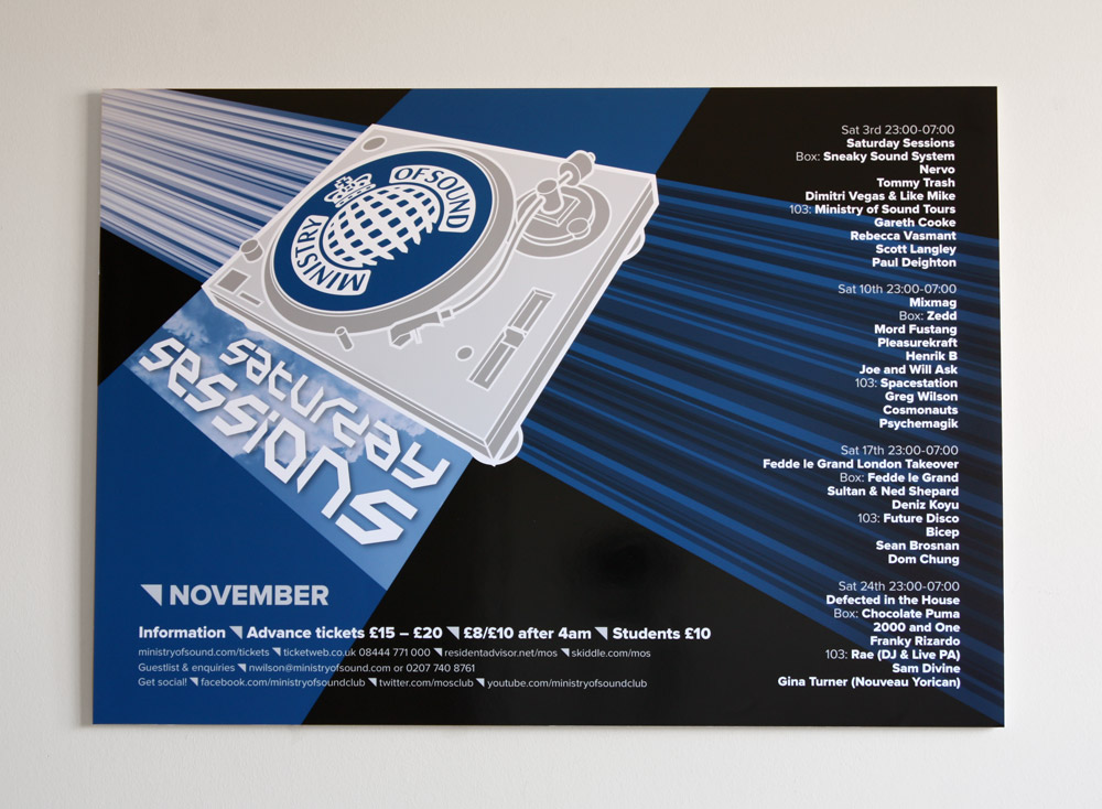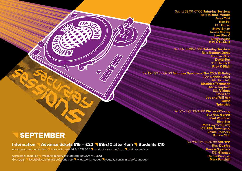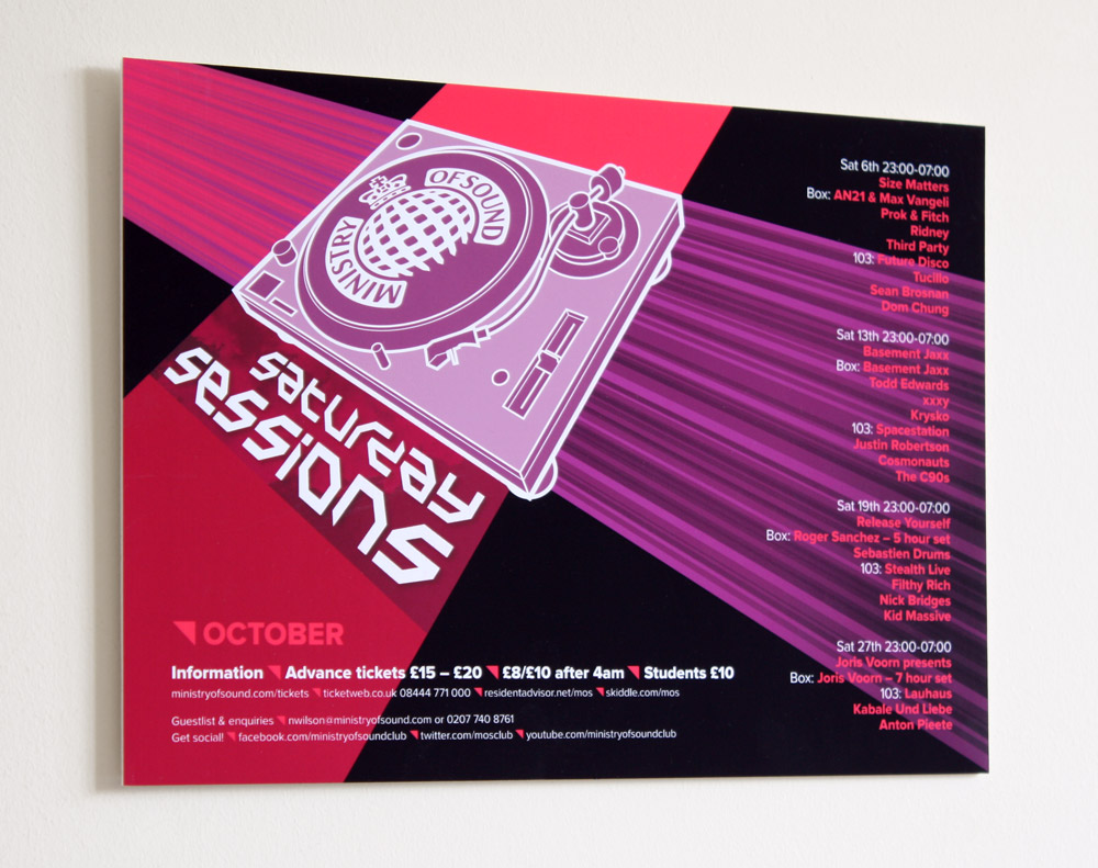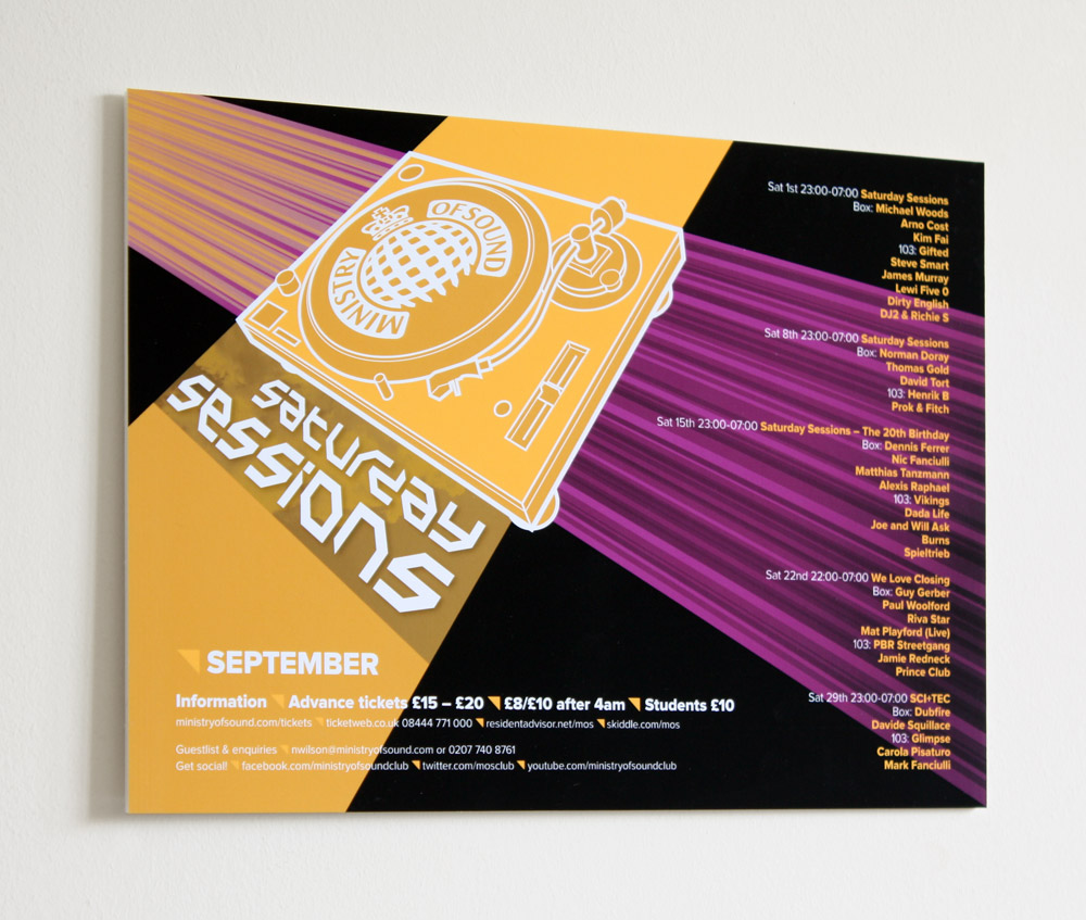 Design work for The Ministry of Sound and their regular Saturday Sessions event. This project was a D&AD Student Awards brief.